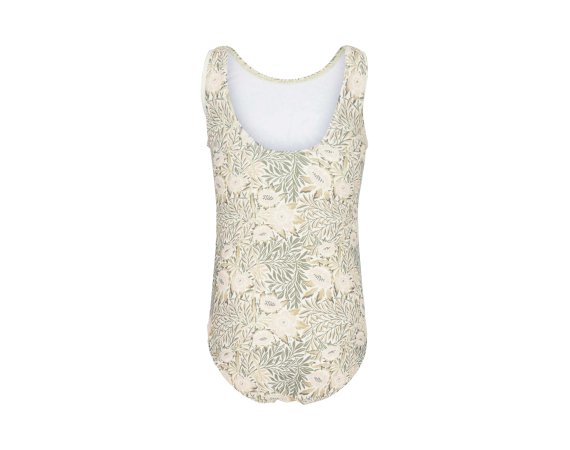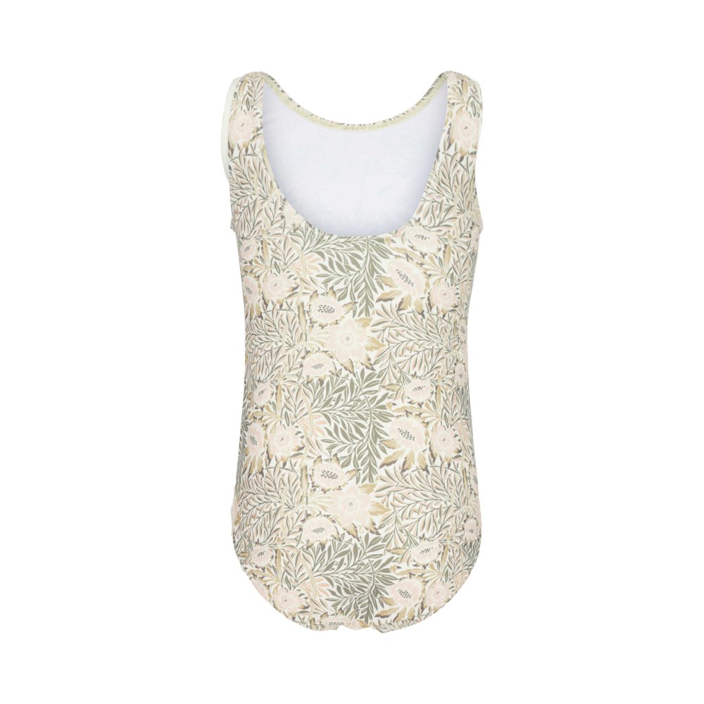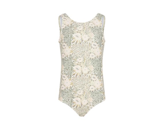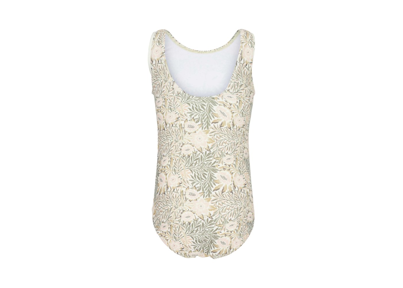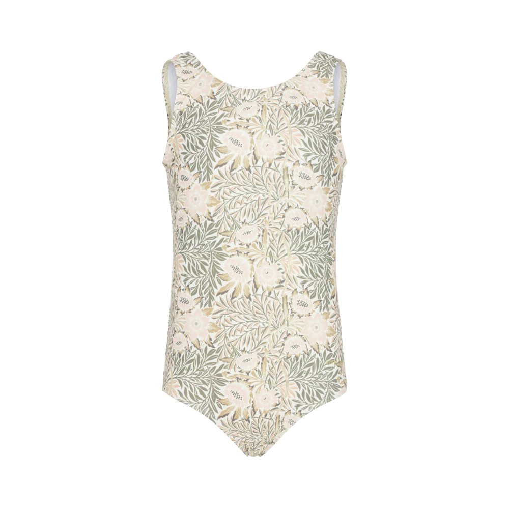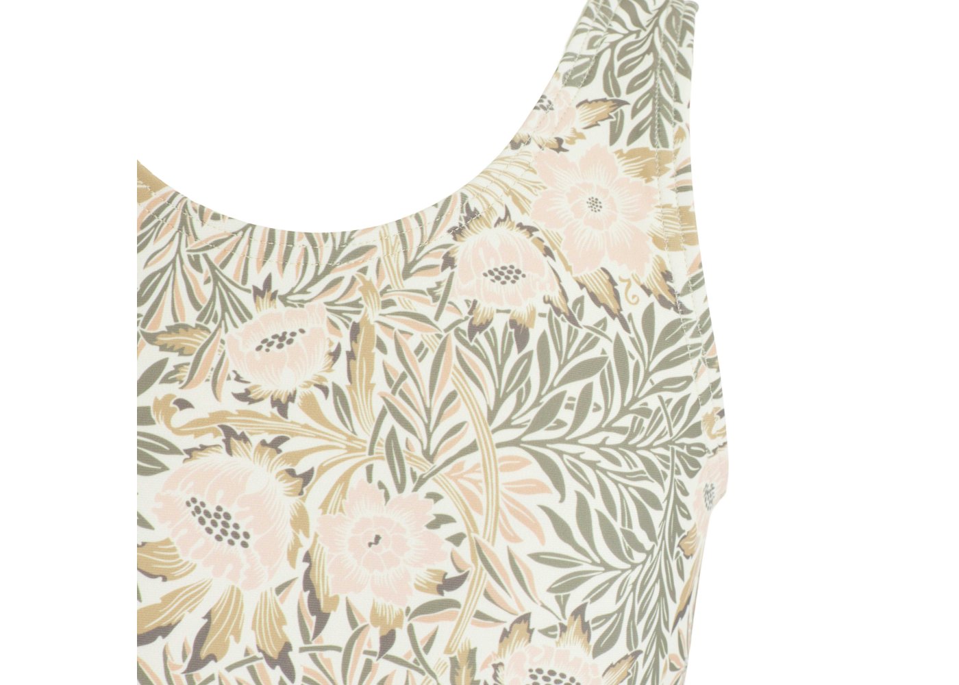 Smuk badedragt i hvid med et flot blade- og blomsterprint i rosa, grønne og brune nuancer.