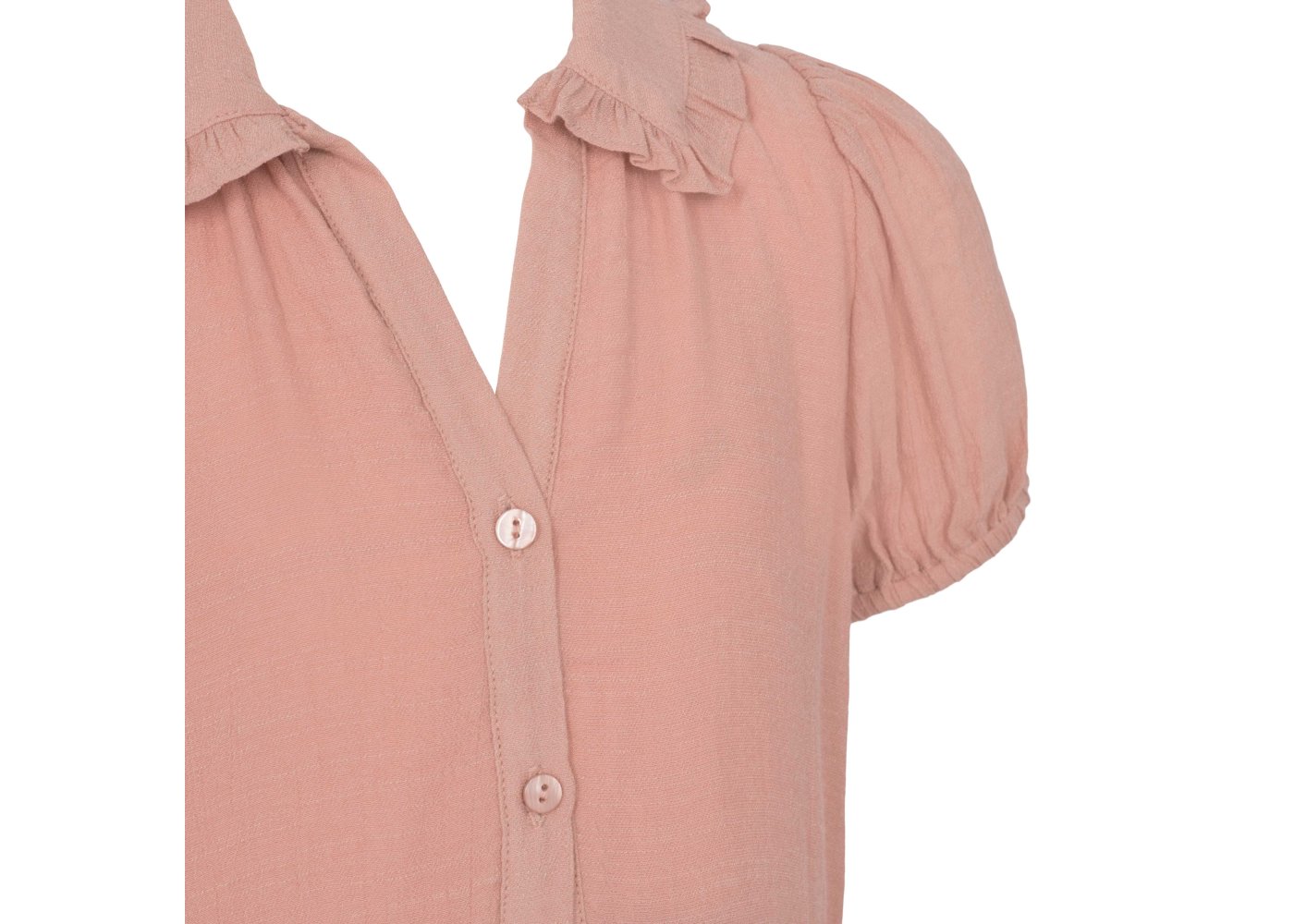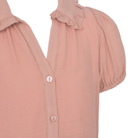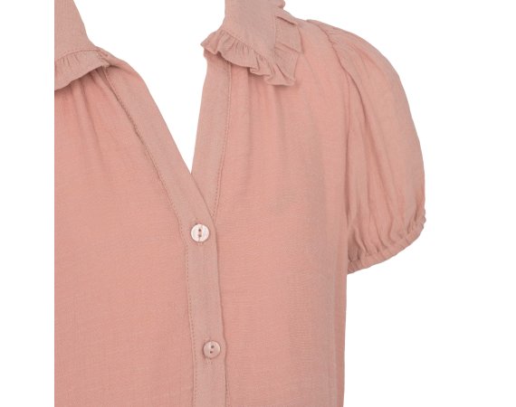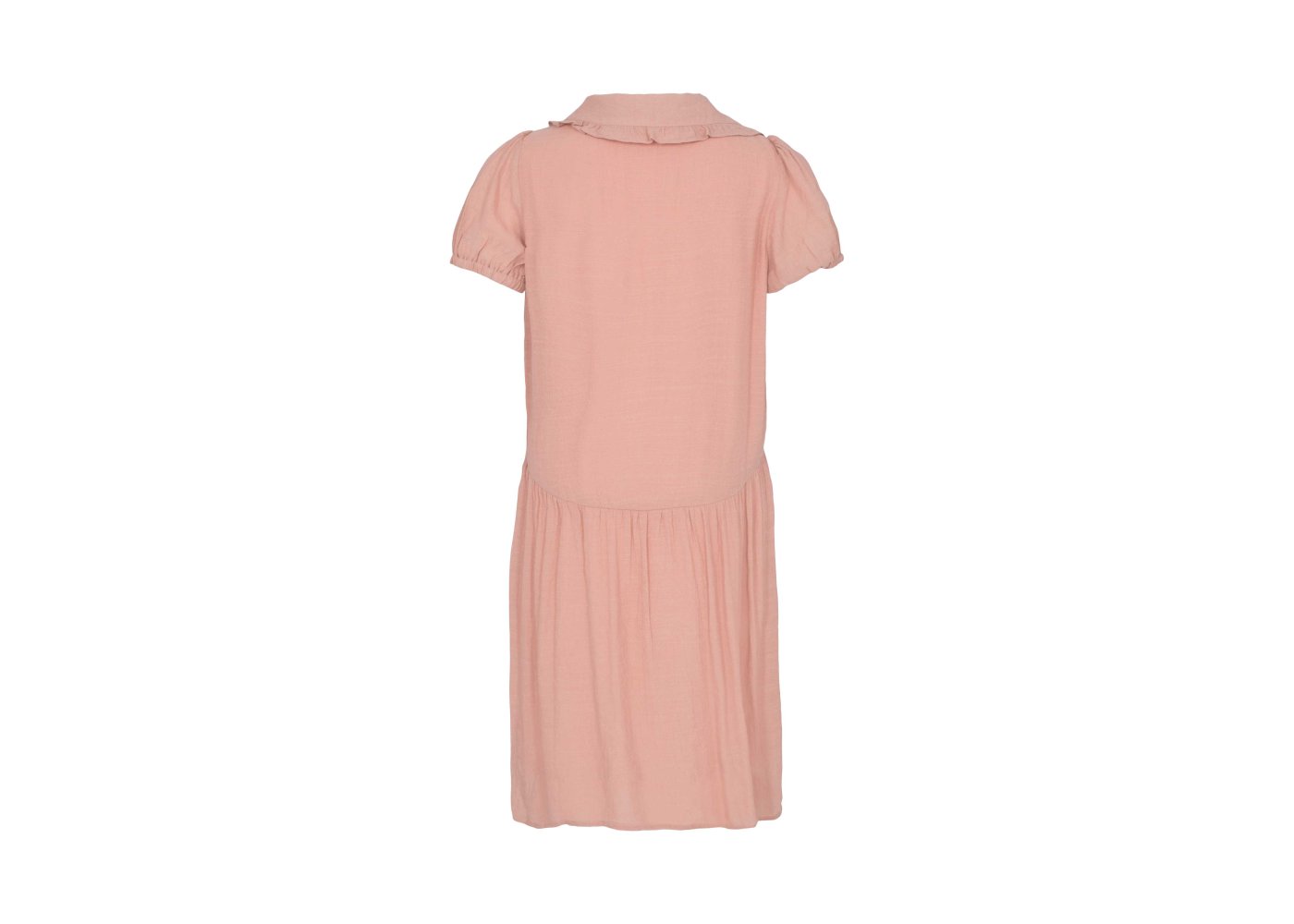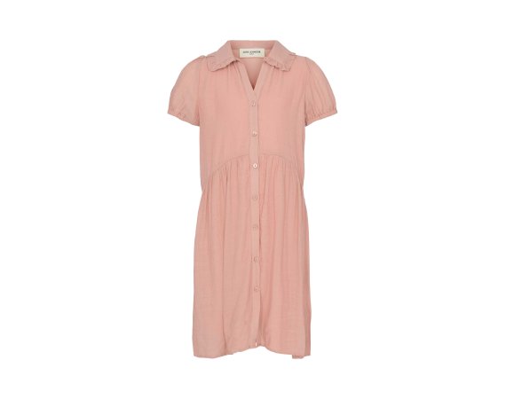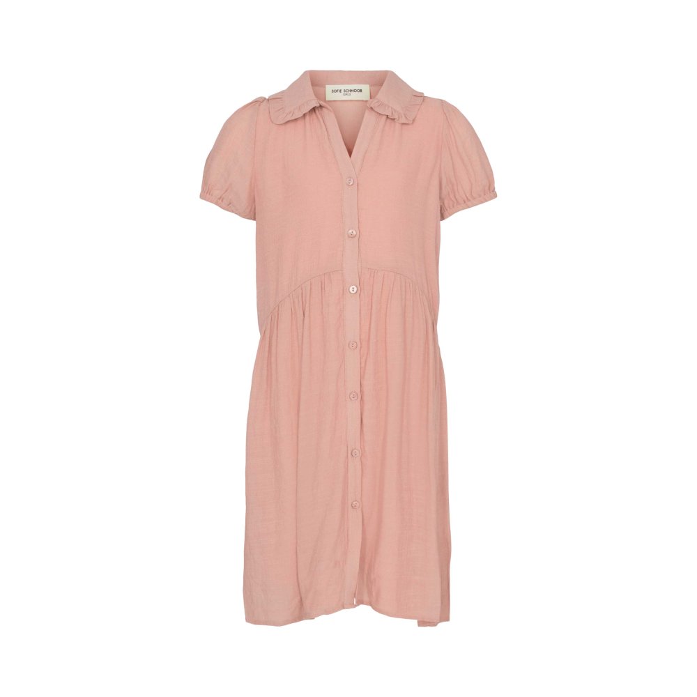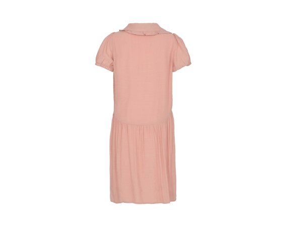 Kjolen har korte ærmer med elastik, der giver den puf og fylde. Den har en fin blondekrave og gennemgående knapper.