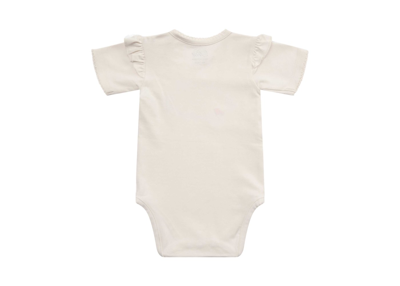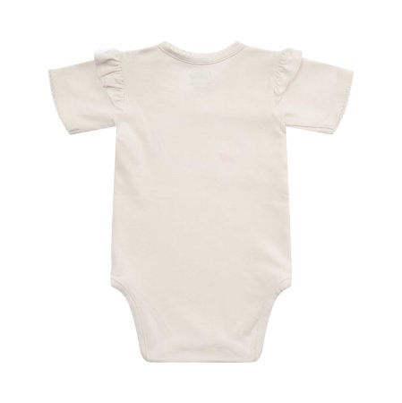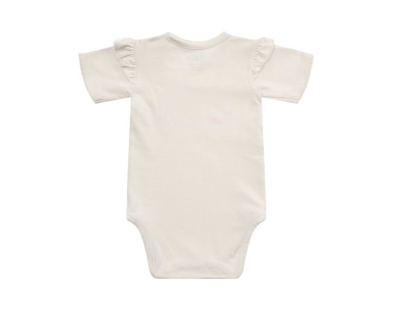 Bodyen har en fin blonde ribkant i halsudskæring og fine flæsekanter på skuldre.