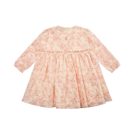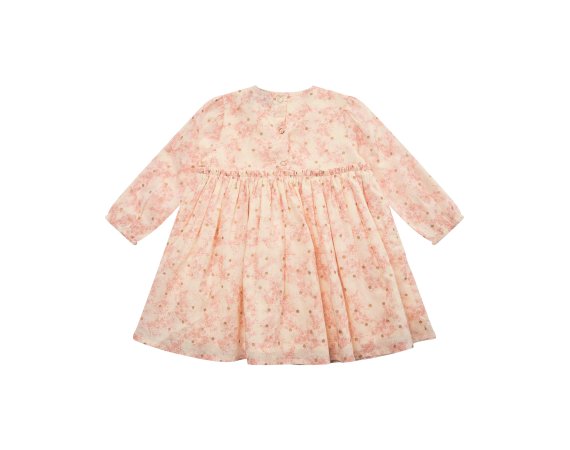 Kjolen har lange ærmer og et fint rynket skørt. Den lukkes med trykknapper bagpå. Tekstil: 100% Bomuld