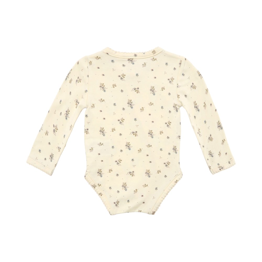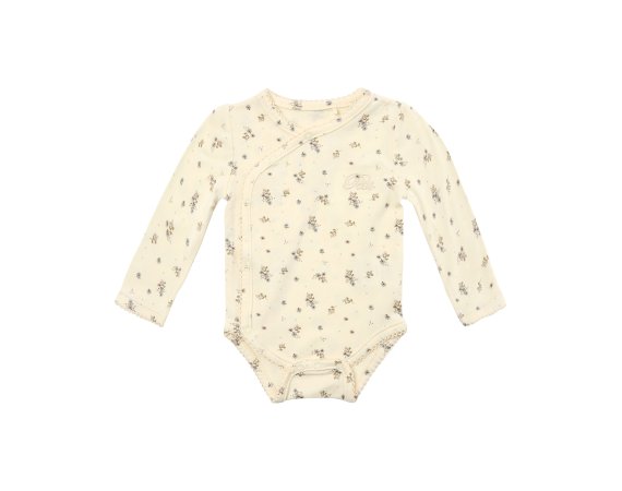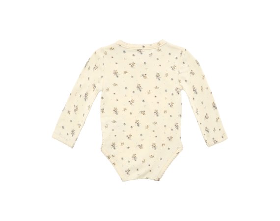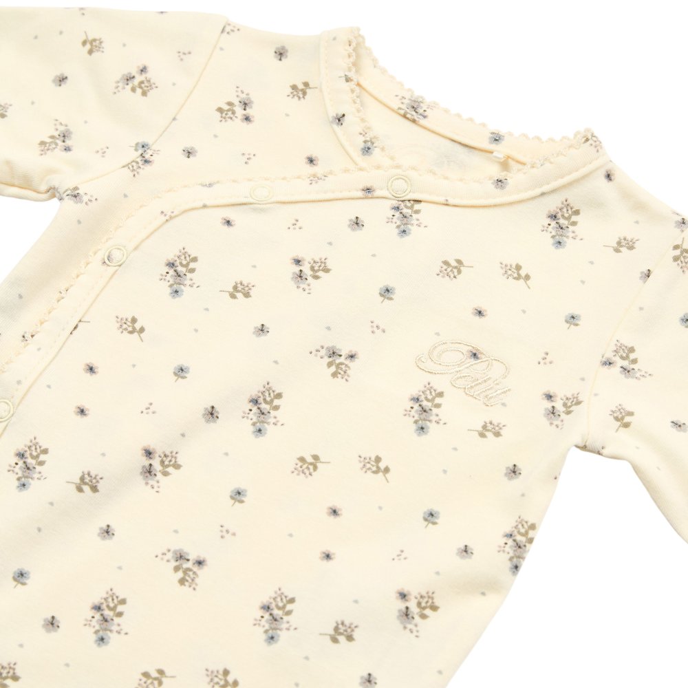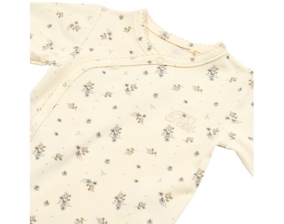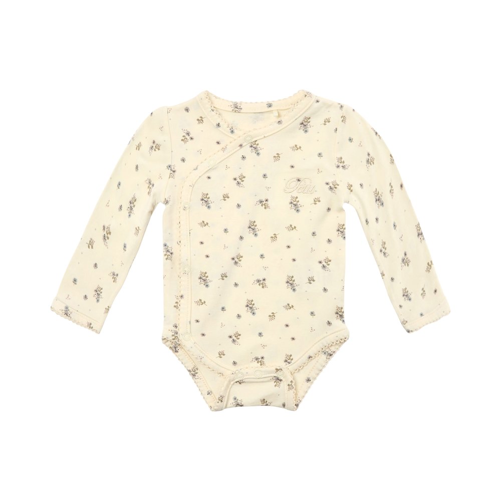 Sød body med fine blå blomster fra Petit by Sofie Schnoor.Bodyen har lange ærmer og fine smalle ribkanter i alle åbninger. Den lukkes foran og imellem ben med trykknapper.