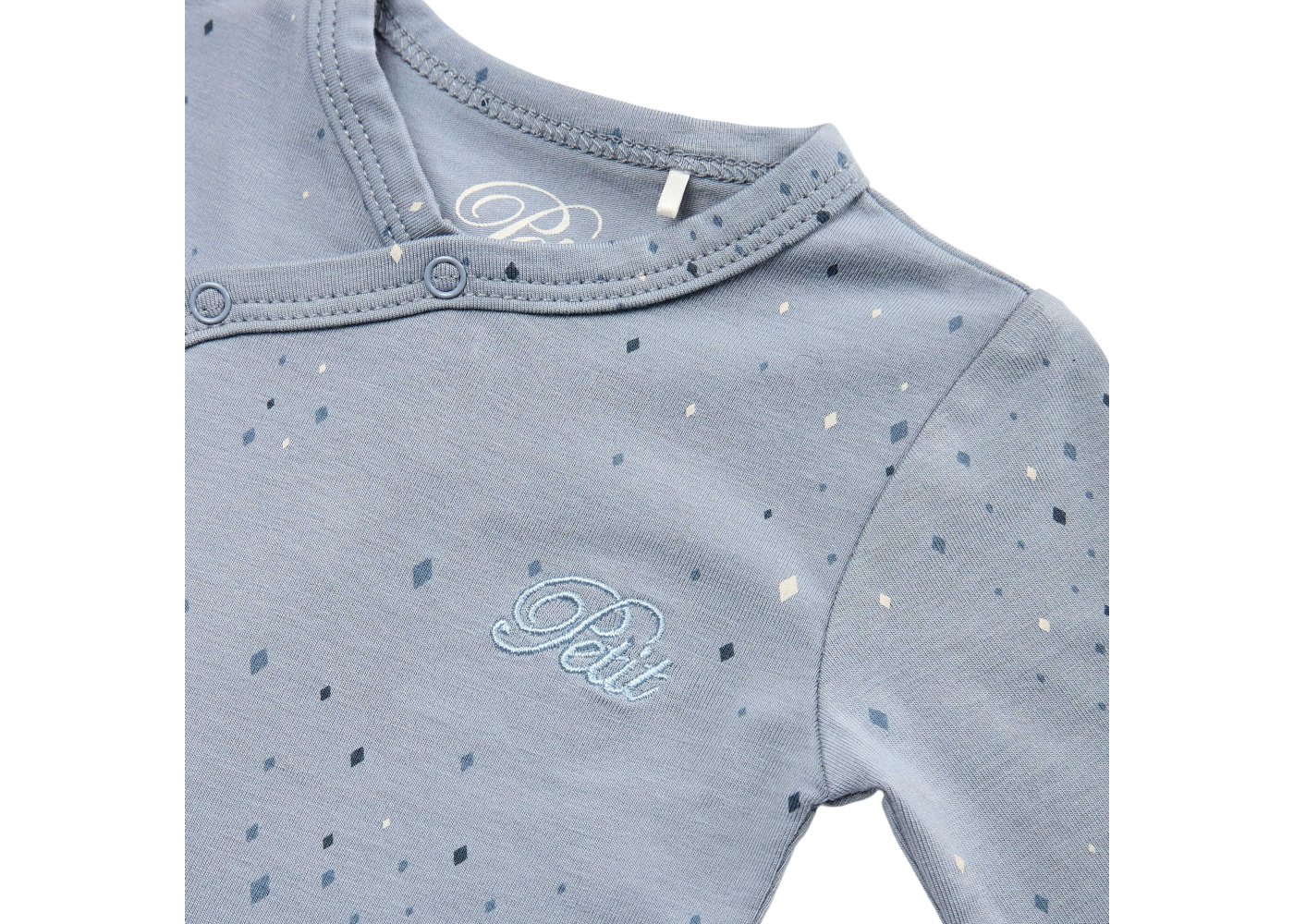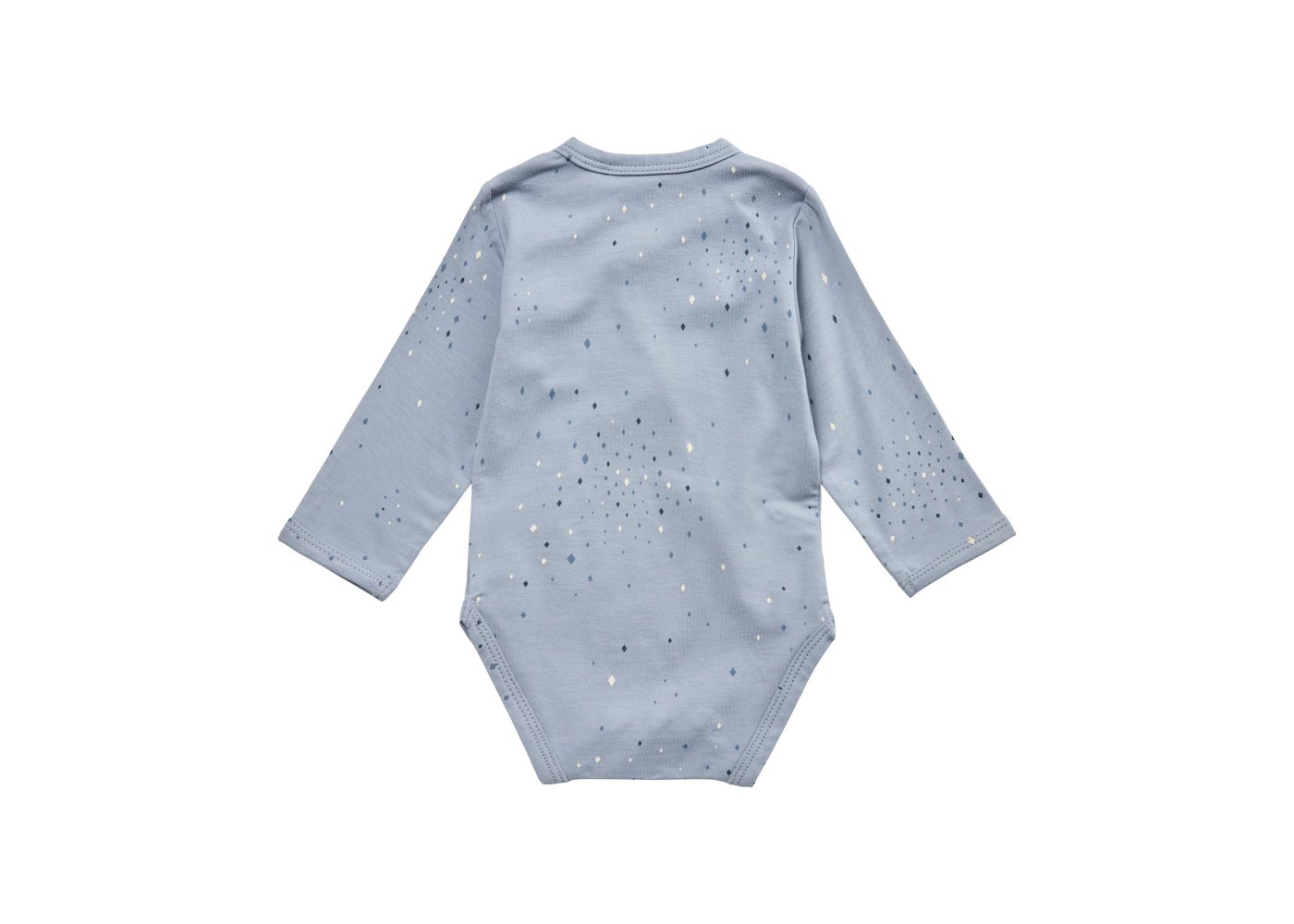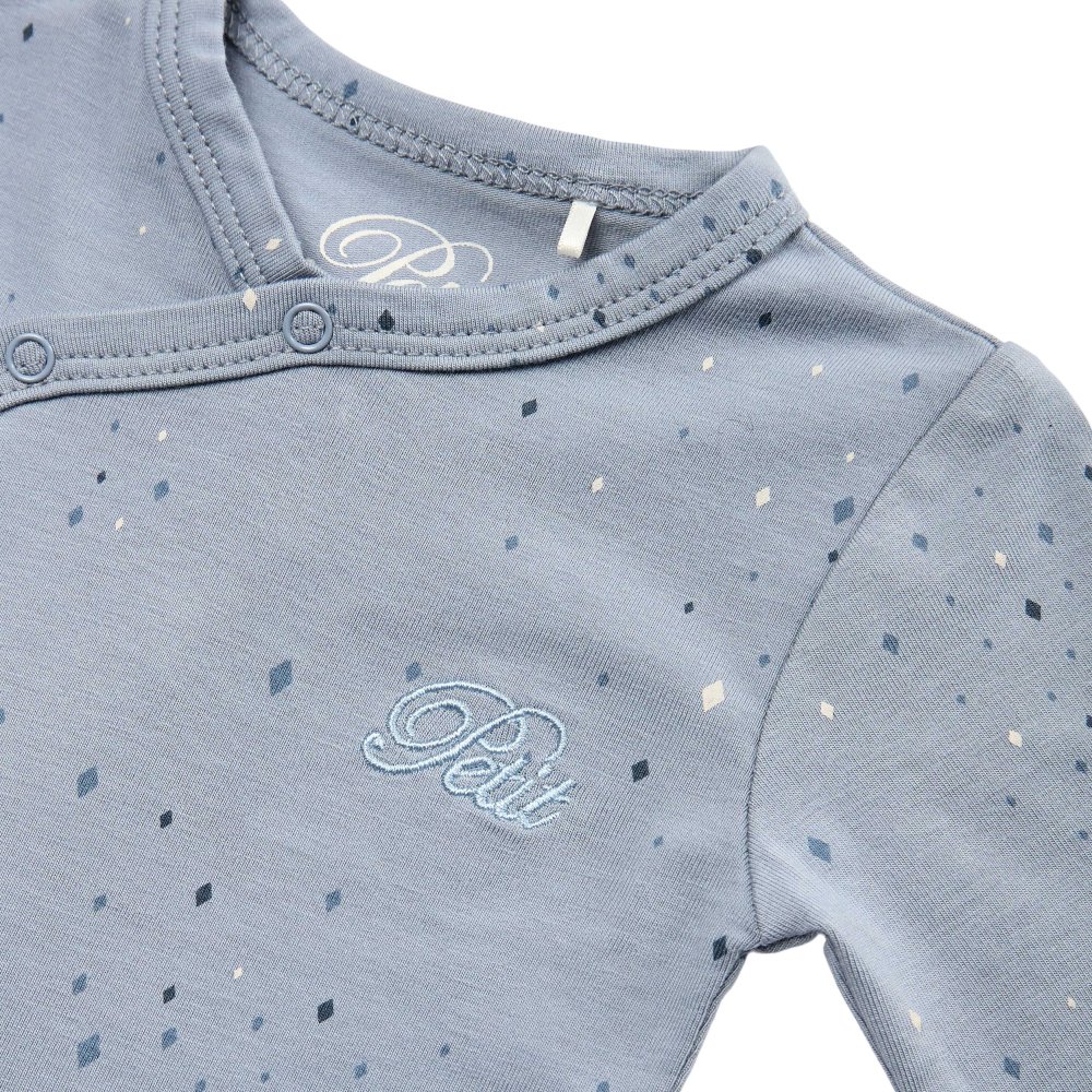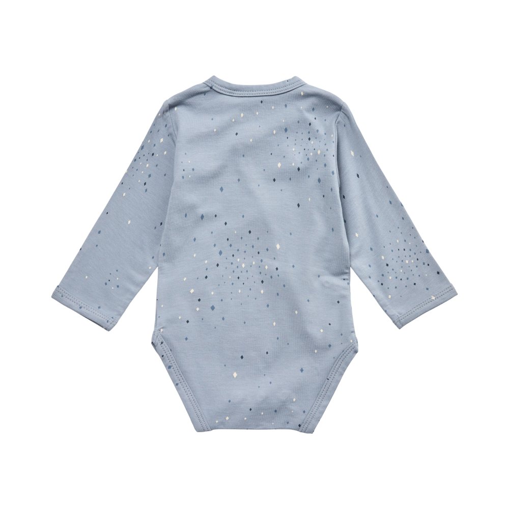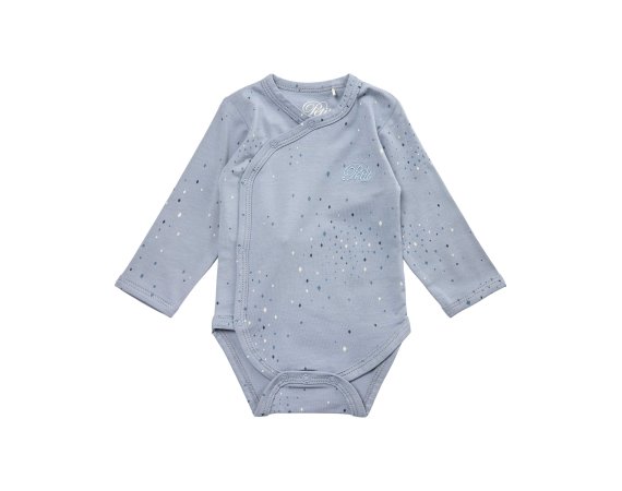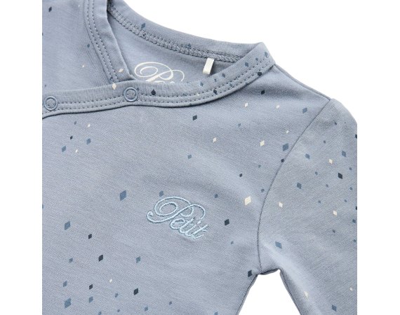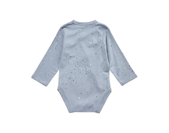 Sød body med fine stjerner fra Petit by Sofie Schnoor.Bodyen har lange ærmer og fine smalle ribkanter i alle åbninger. Den lukkes foran og imellem ben med trykknapper.