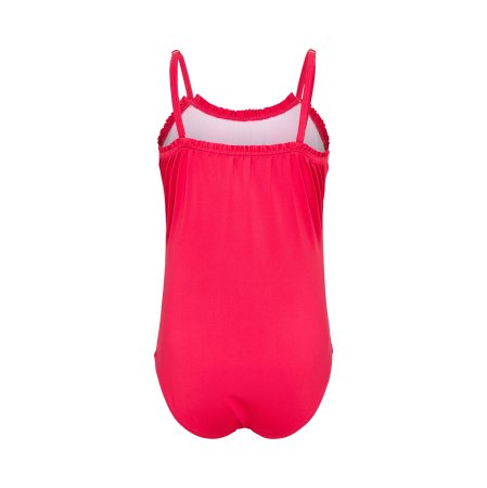Smuk lys pink badedragt fra Sofie Schnoor.Badedragten har smalle justerbare skulderstropper, elastikkanter og rynk i åbninger og fine flæse kanter.