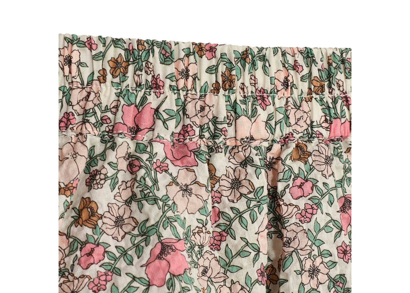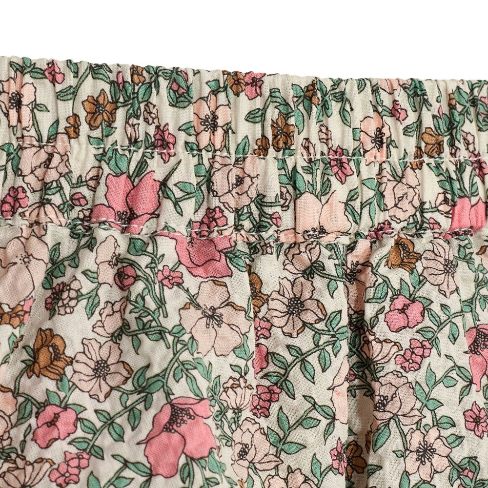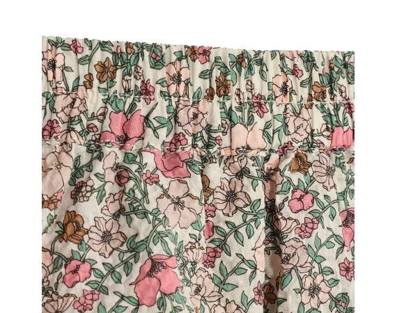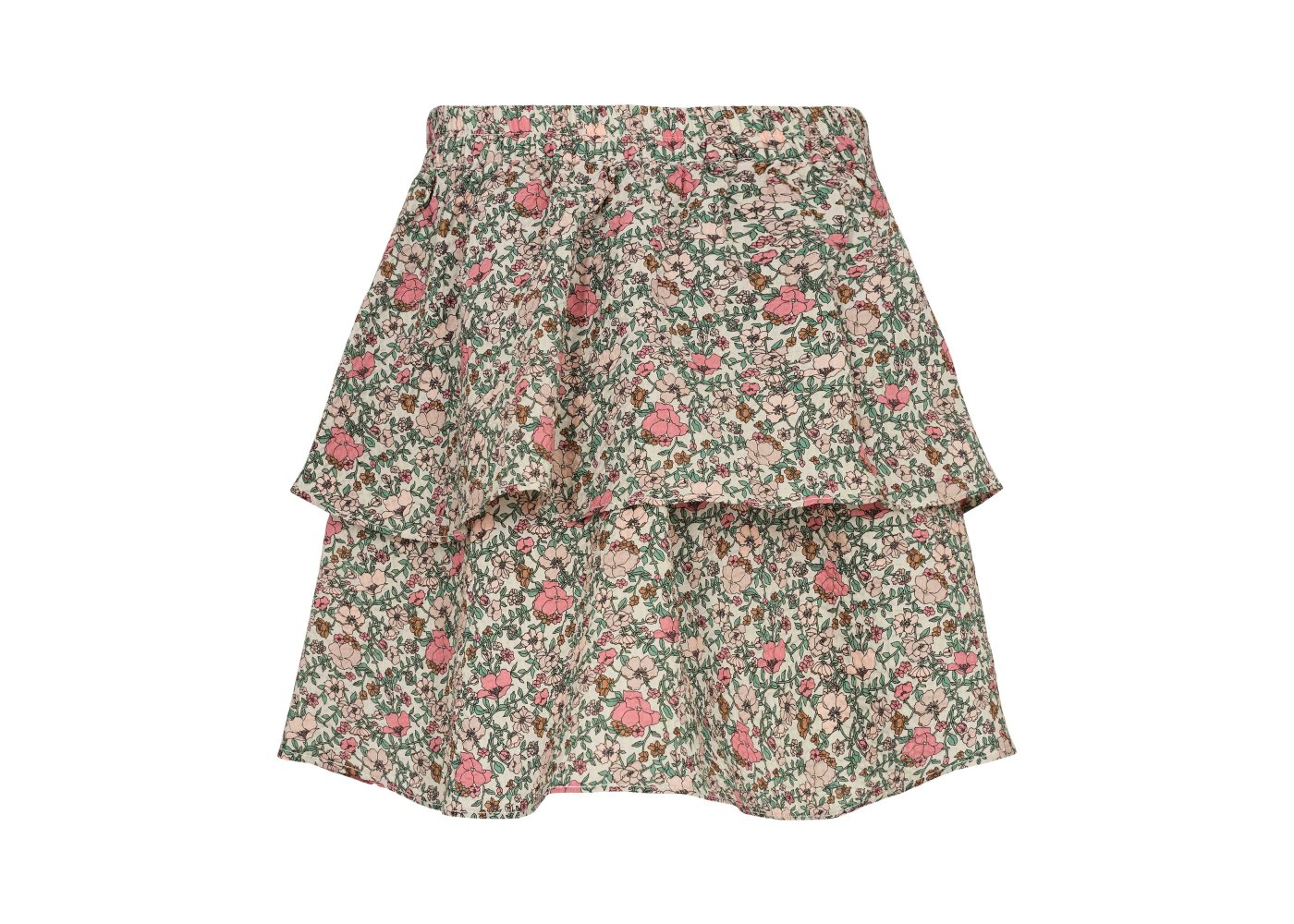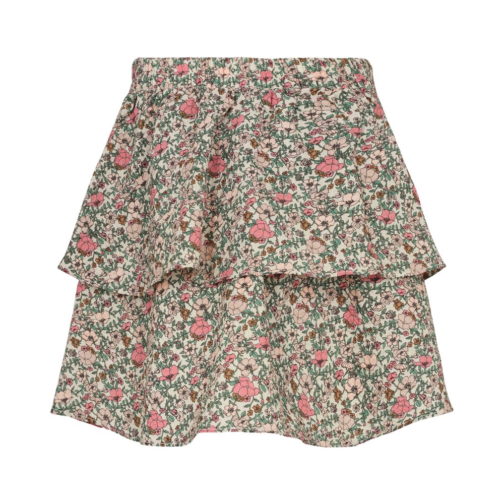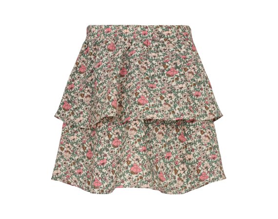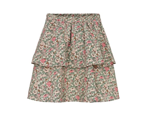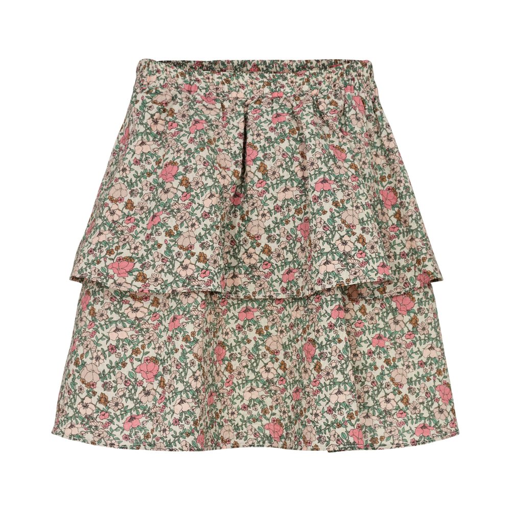 Fin nederdel i beige med blomsterprint i rosa og grønne nuancer. Nederdelen har en bred elastik i talje og et todelt skørt i to lag, og er derfor ikke gennemsigtig.