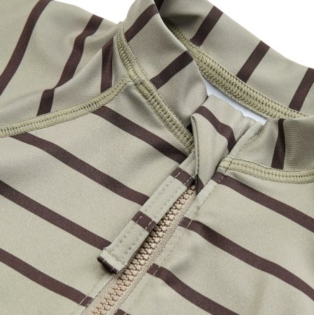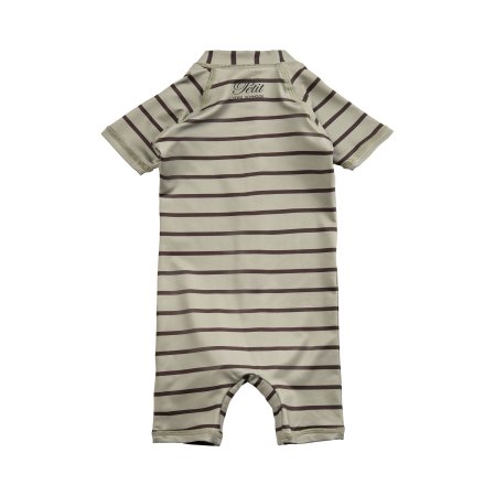 Badeheldragt med korte ærmer og ben. Dragten åbnes fortil med lynlås med en indvendig vindstolpe og hagebeskytter.