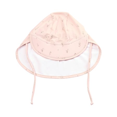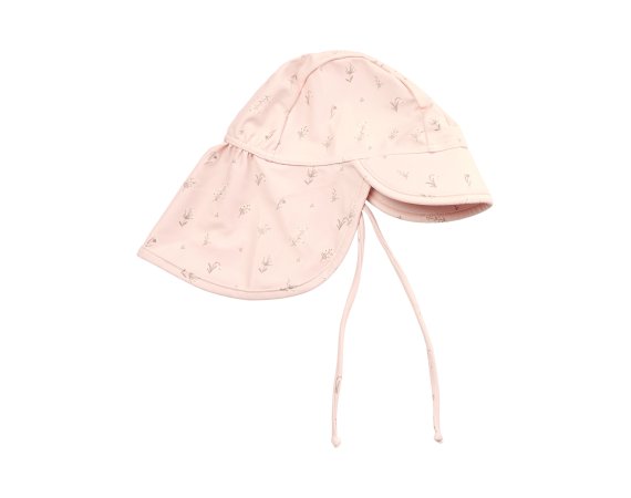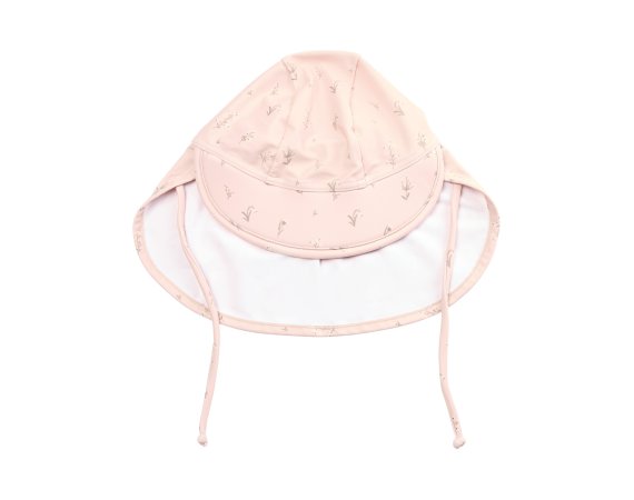 Hatten har bindebånd og en lang nakke, der skåner barnet imod solens stråler.