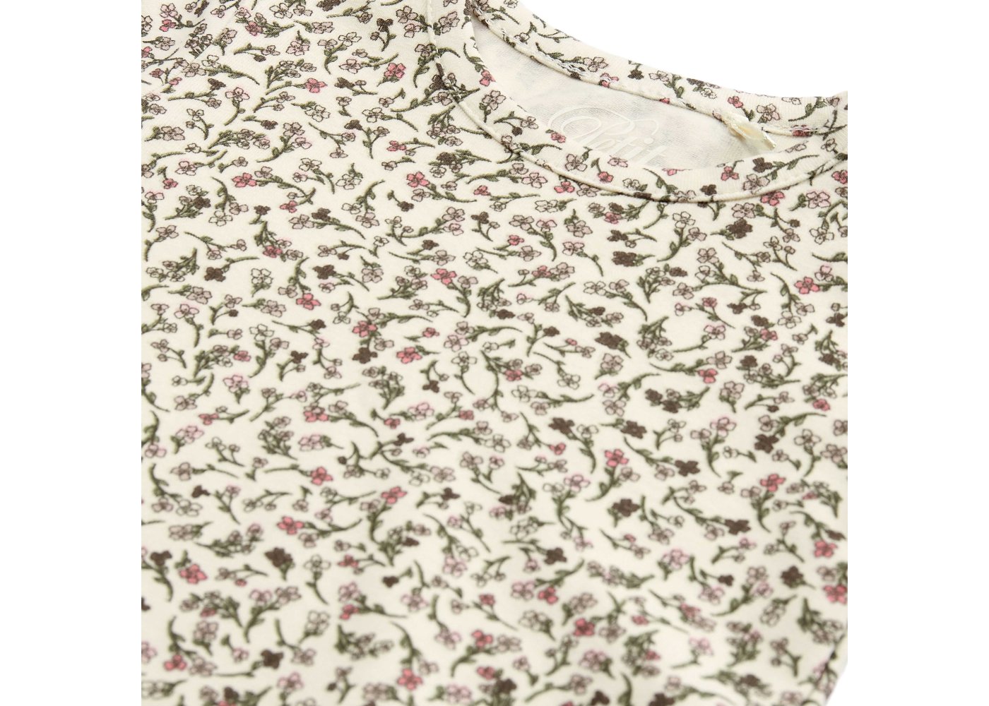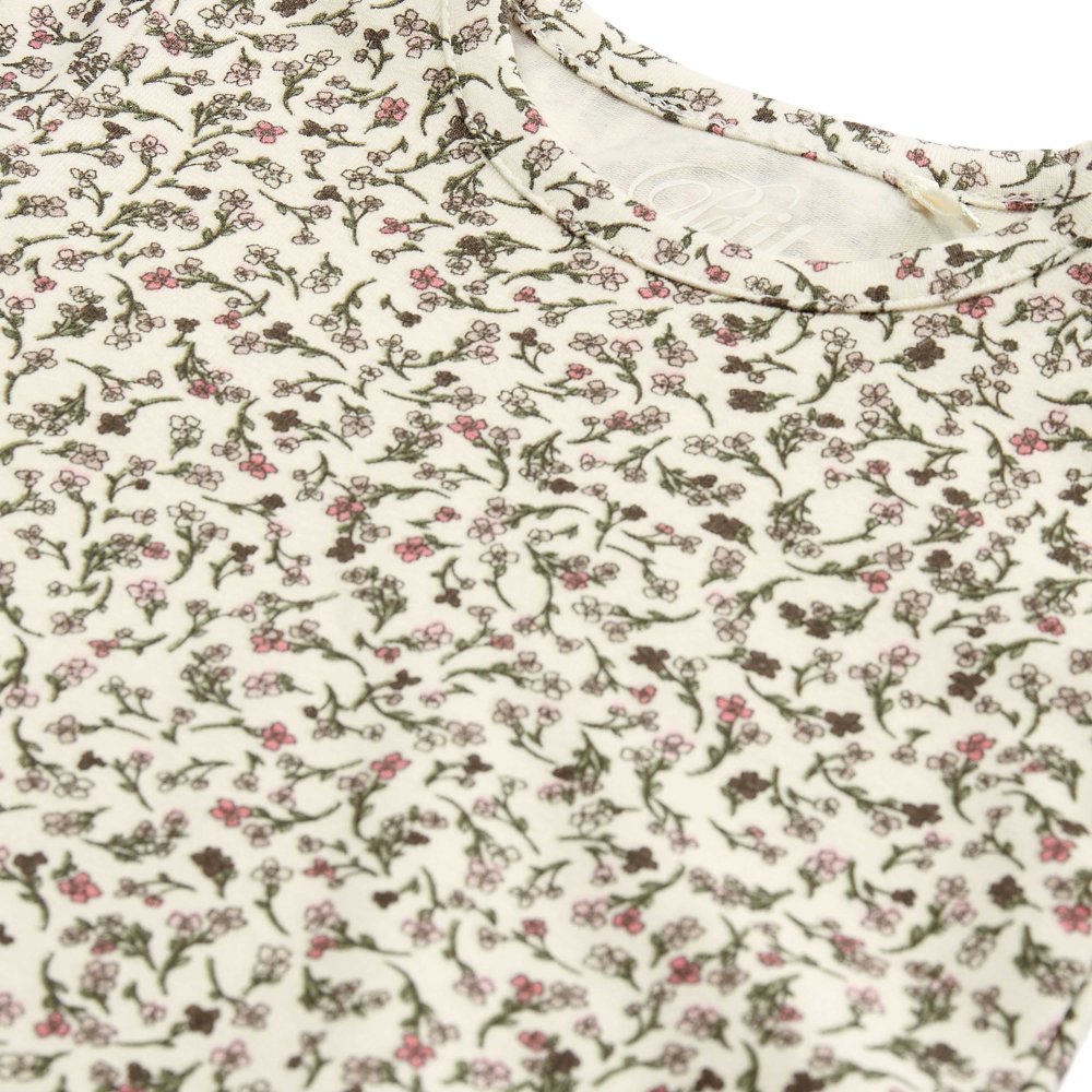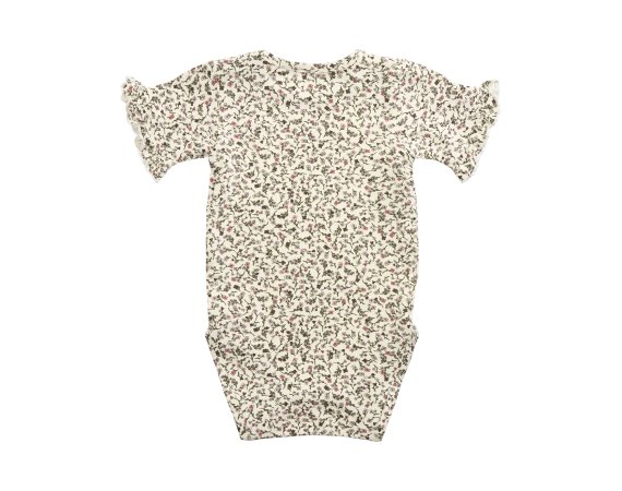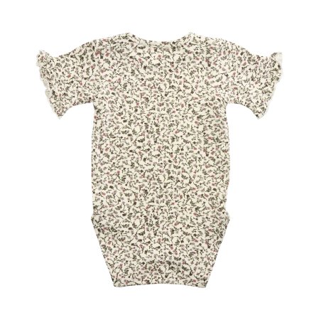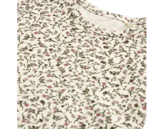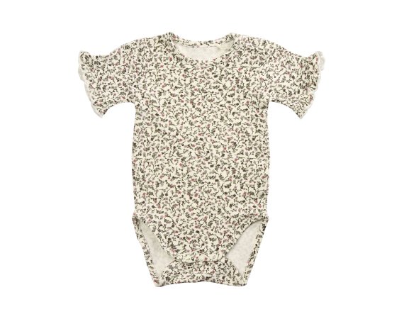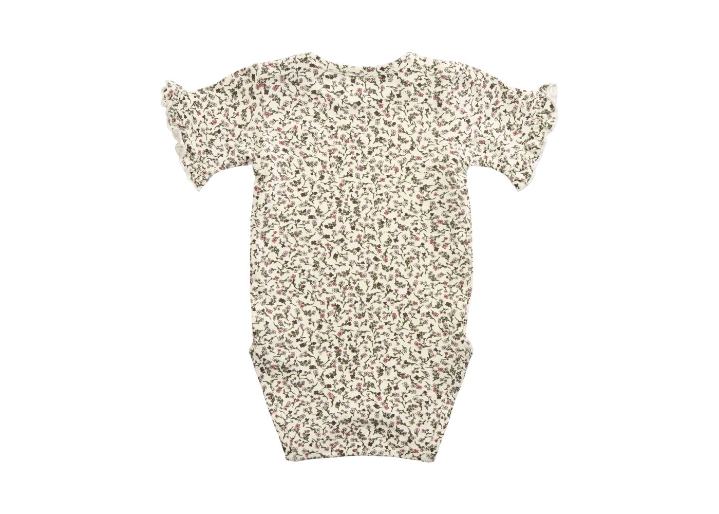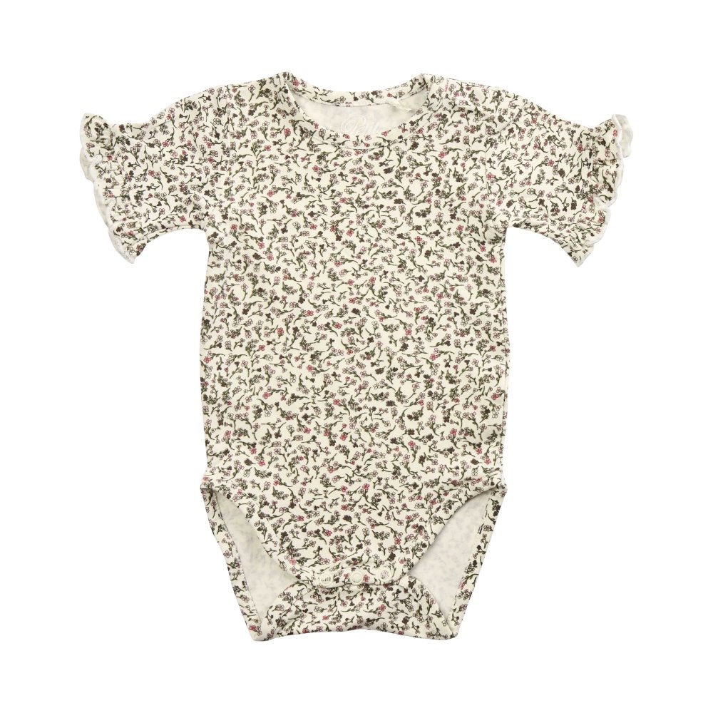 Super smart body i antik hvid med blomsterprint fra Petit by Sofie Schnoor.Bodyen har fine flæseærmer og lukkes med trykknapper på skulder og mellem ben.