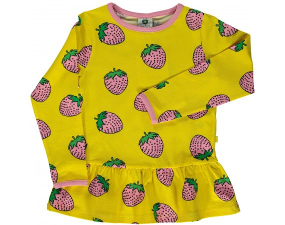 T-shirten har lange ærmer, sødt pynteskørt og en fin ensfarvet kant omkring hals og håndled.