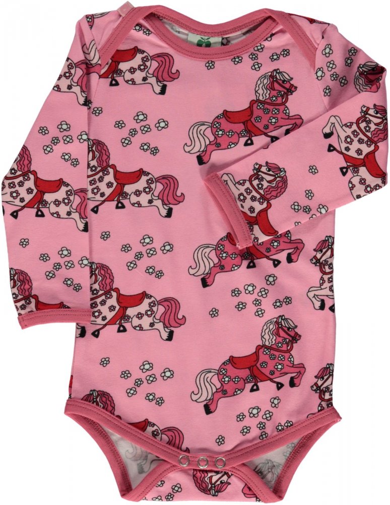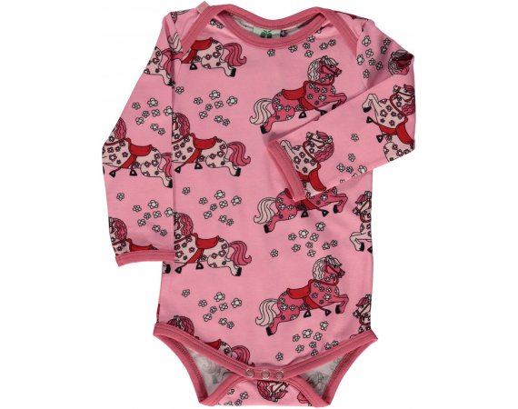 Smart body i blødt økologisk bomuld med all-over print af hesteBodyen har ensfarvet kant ved alle åbninger, kuvertlukning på skuldre og trykknap lukning mellem ben.