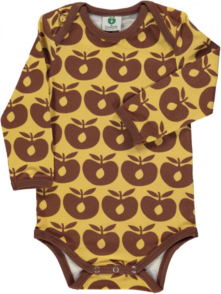 Sød body i blødt økologisk bomuld med æble printBodyen har ensfarvet kant ved alle åbninger, kuvertlukning på skuldre og trykknap lukning mellem ben.