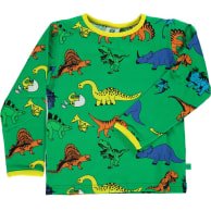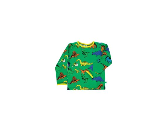 T-shirten er i grøn farve og fyldt med dinosaurer. Den har ensfarvede gule kanter i halsudskæring og ved håndled.