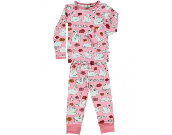 Lækker nattøj i rosa med svane og åkandeprint.T-shirten har ensfarvede mørkerosa kanter i halsudskæring og ved håndled. Buksen har en mørkerosa bred rib ved ankler og en bred elastik i livet. Sættet er lavet i en blød og strækbar bomuldskvalitet.