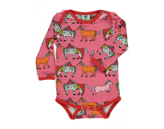 Skøn langærmet body i glade farver fra Småfolk.Bodyen er i rosa farve og fyldt med heste. Den har ensfarvede rødlige kanter ved alle åbninger. Bodyen har kuvertlukning ved skuldre og lukkes med trykknapper imellem ben.