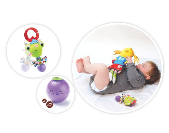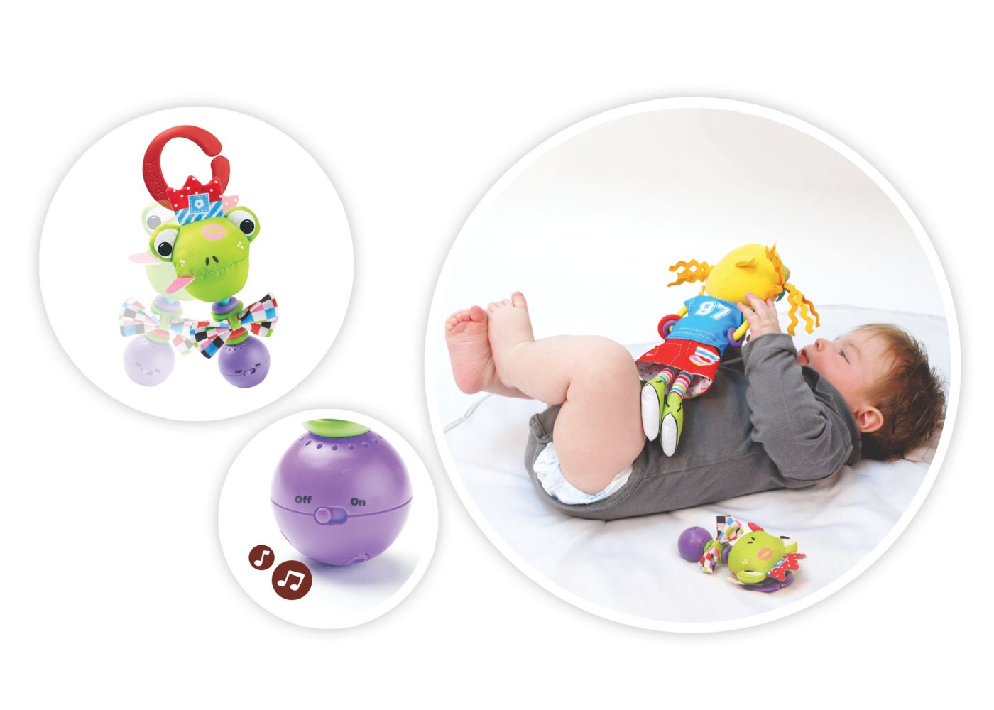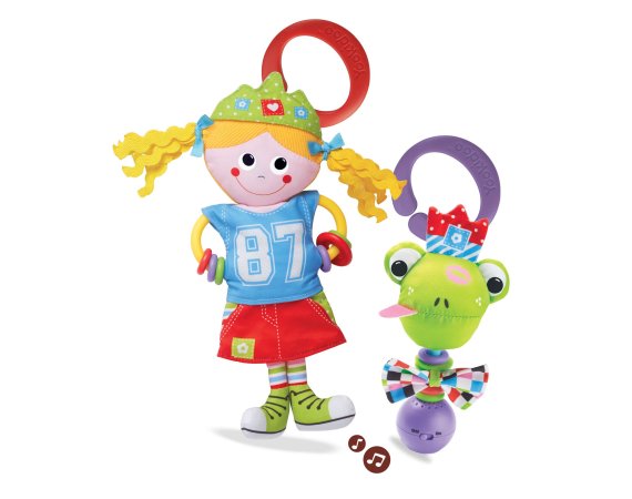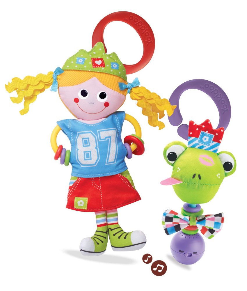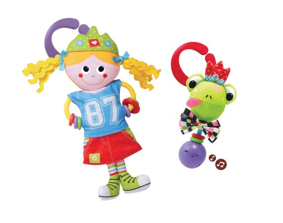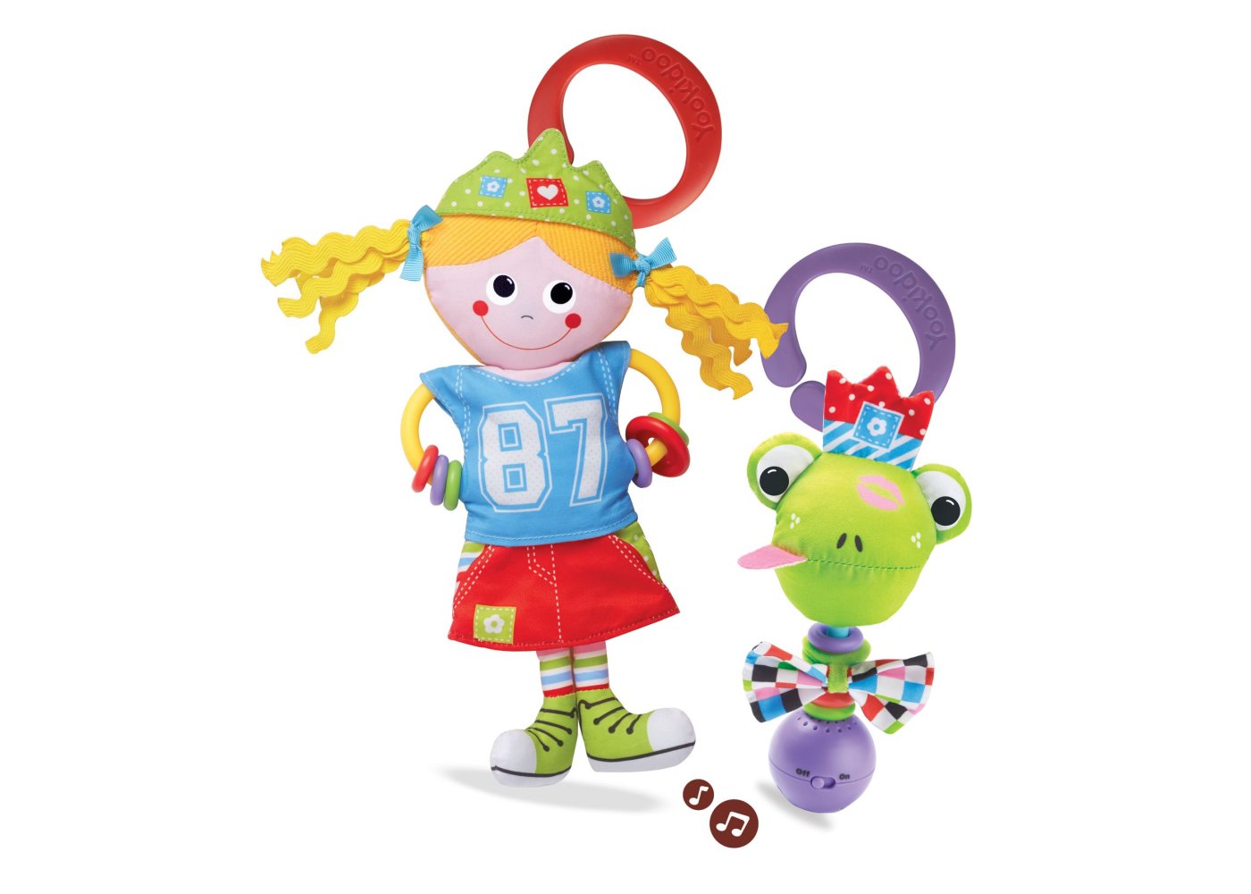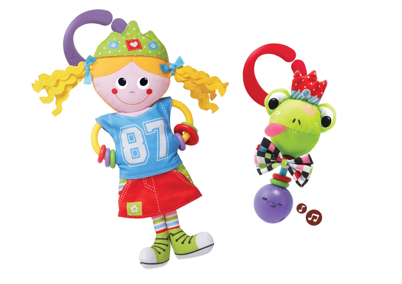 Prins frø og prinsessen er udstyret med ringe, og kan bruges indendørs på kravlegården eller sættes fast på klap- og barnevogn, når I skal på farten.