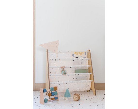 Flot gulv reol i børnehøjde til tegninger, male- og børnebøger.