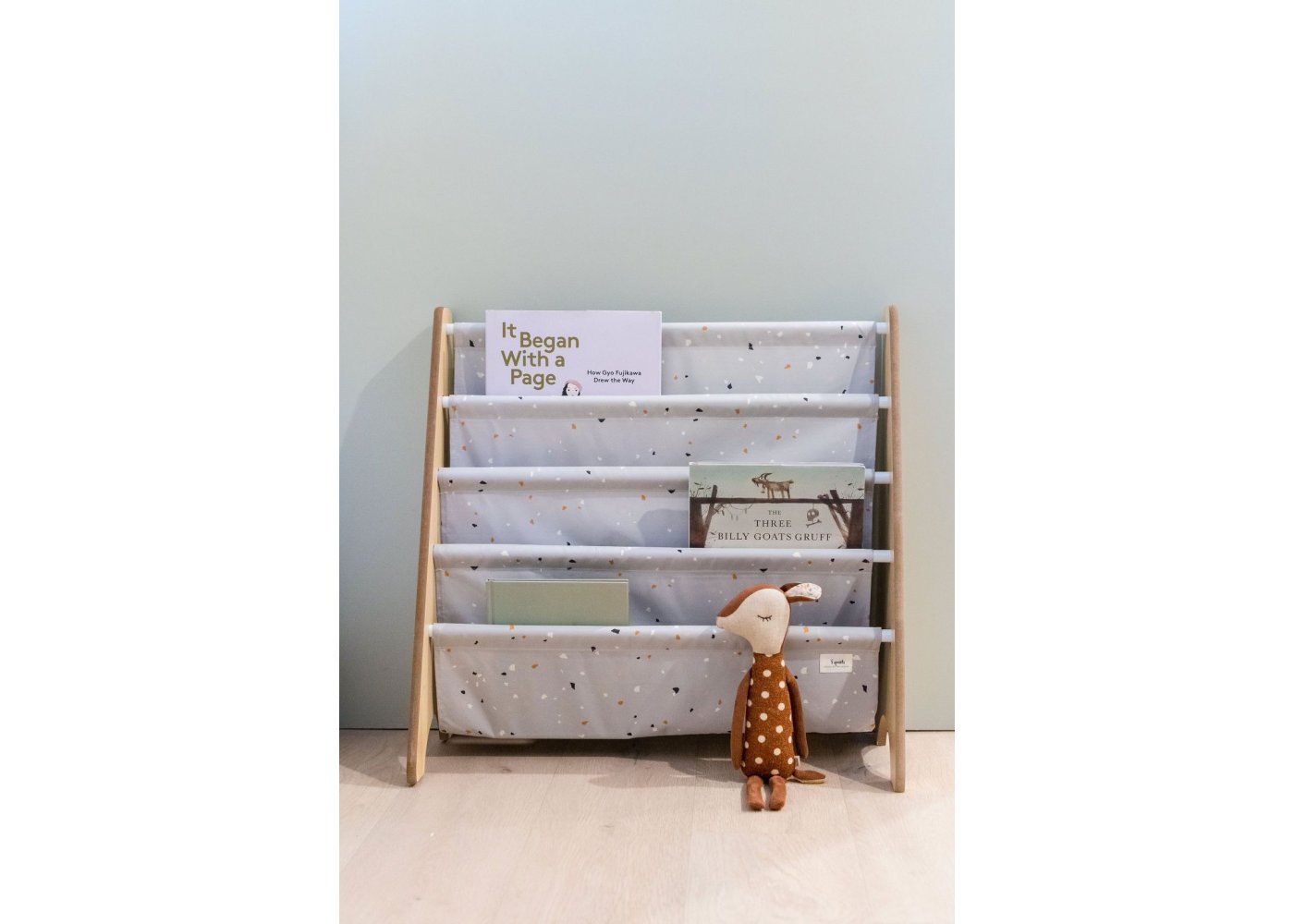 Denne her reol er i flot terrazzo mønster i lysegrå.