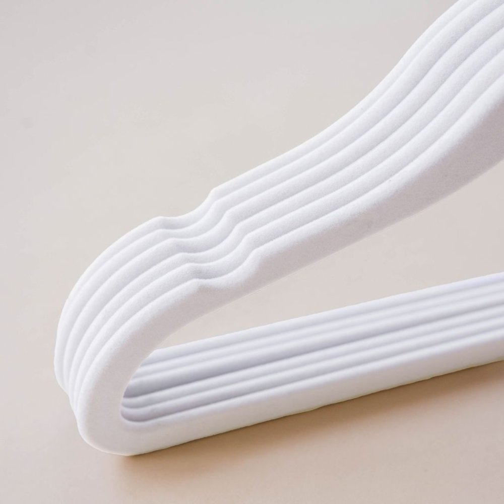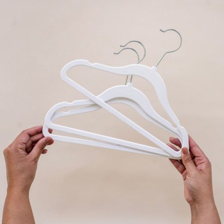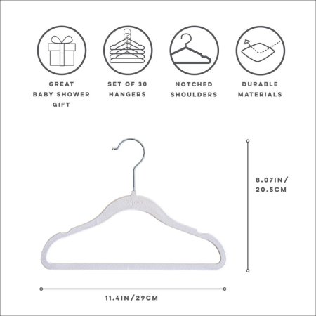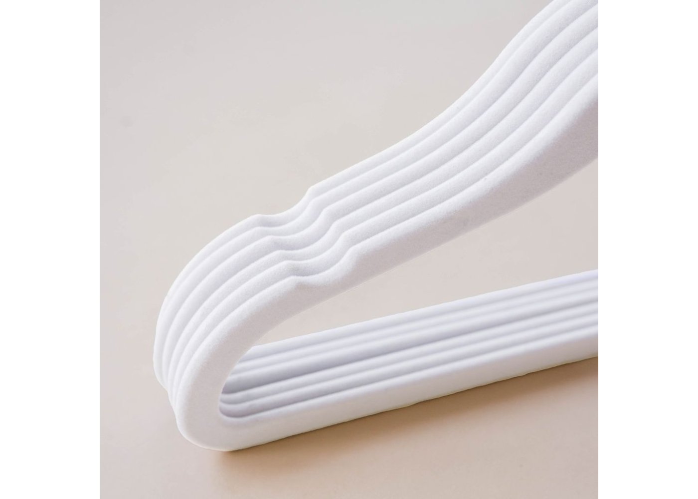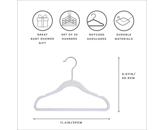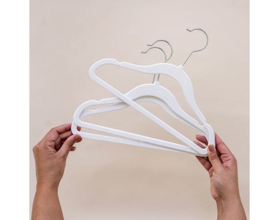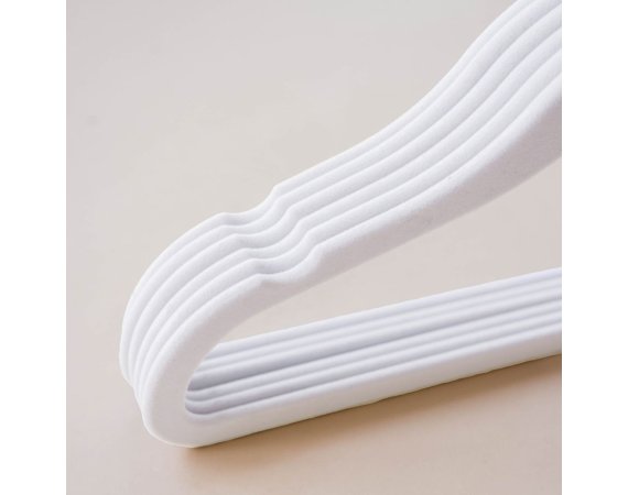 Bøjlen har bløde afrundede kanter, der sørger for, at tøjet holder formen. Den har velourfinish med en skridsikker overflade, og små forsænkninger til stropper, der til sammen sikrer, at tøjet sidder godt fast på bøjlen uden at falde ned.