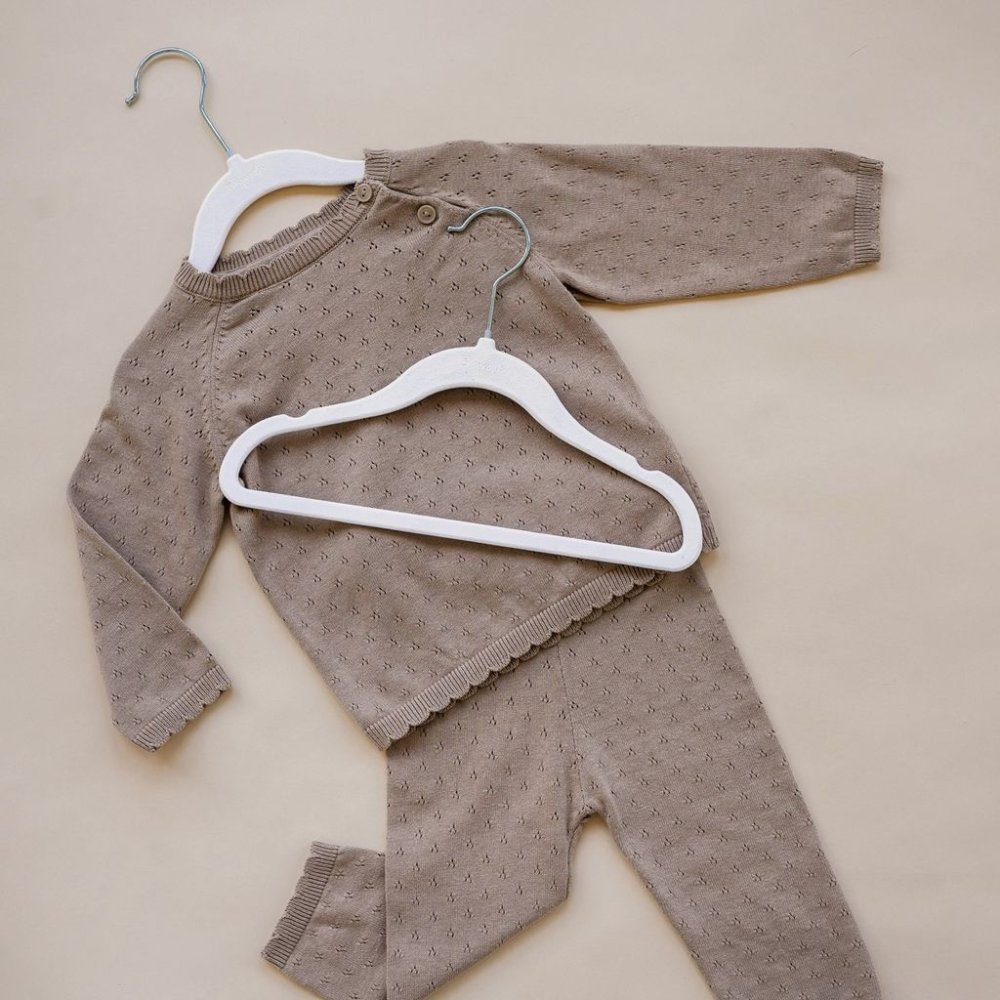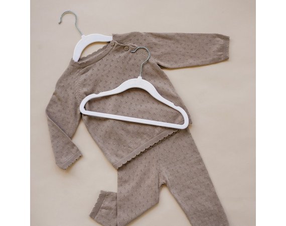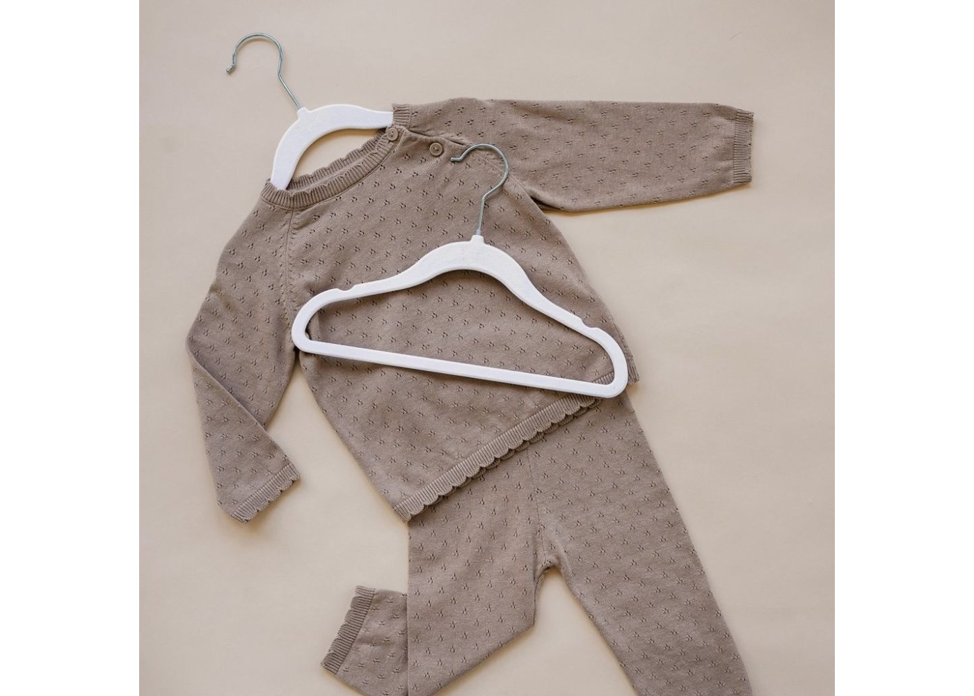 Her får du 15 stk. lækre velourbøjler i blåbær/creme til ophængning at dit barns tøj.
